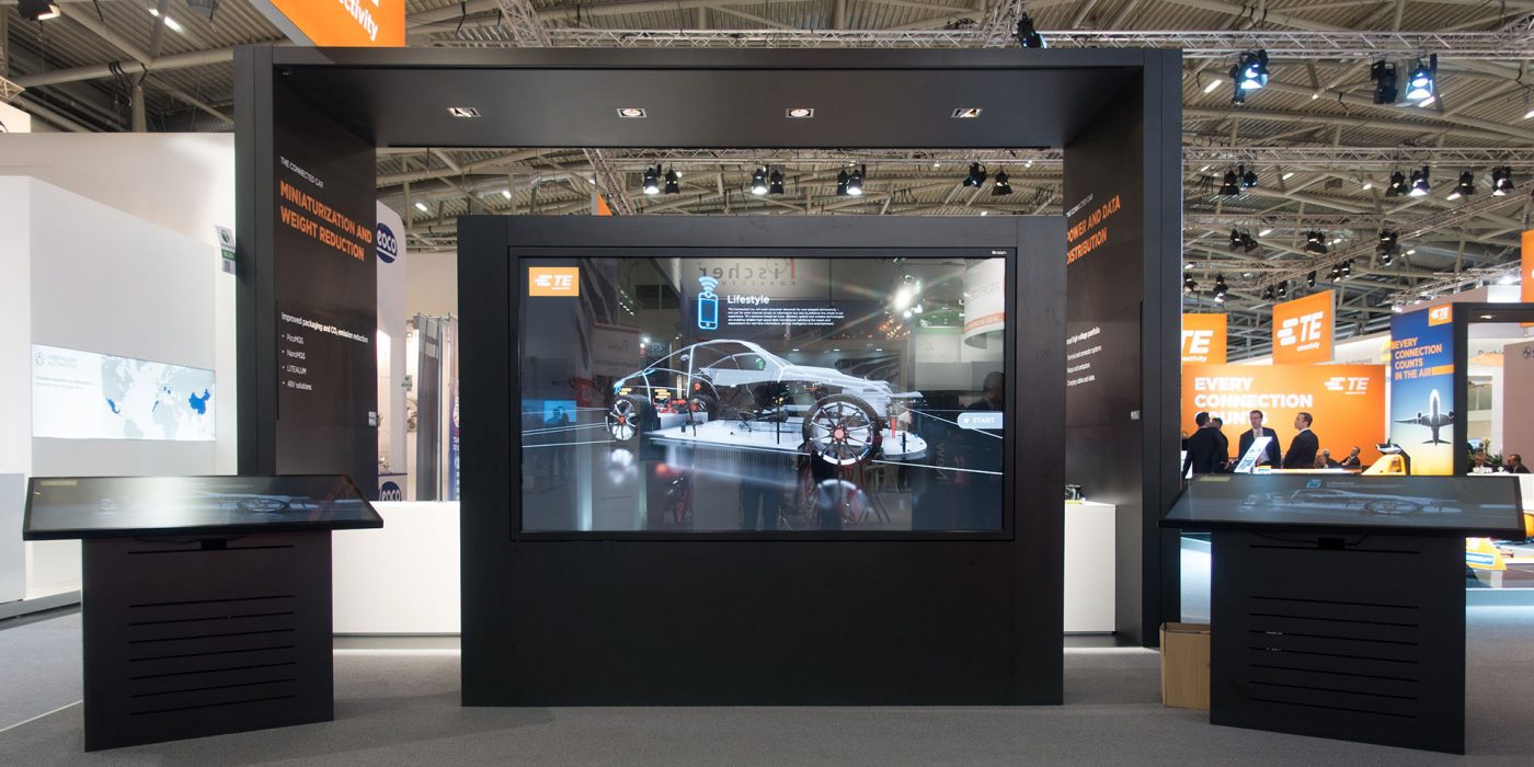 The application is showing a high class rendered car made out of glass in which multiple products of TE where placed. It was used to present TE’s products, highlights and usabilities in a very realistic looking style.